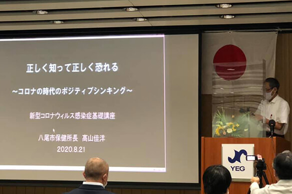 第二部は『アフターコロナこれからどうなる?経営者が知っておくべき新型コロナウイルス感染症対策』をテーマに八尾市保健所長 髙山氏と八尾市役所危機管理担当部 太田氏を招いて、新型コロナウイルス感染症に対して『正しく知って正しく恐れる』基礎講座・新しい生活様式を講演いただきました。